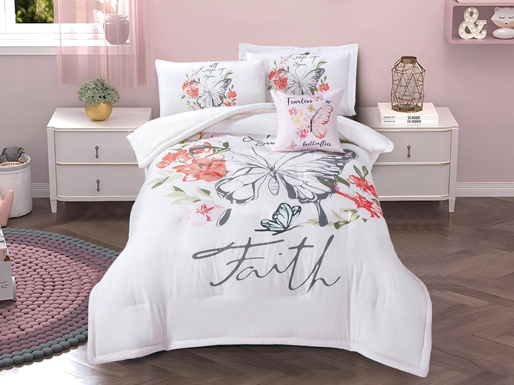 مفرش دالي للأطفال من ماركة مفارش العييري من أجل ليالي هانئة ومريحة كما يستحق طفلك من خامة المايكروفايبر عالي الجودة ذو الملمس الناعم المشابه لملمس القطن وبتصميم ملائم للصغار عبارة عن رسومات لفراشة محاطة بورود .