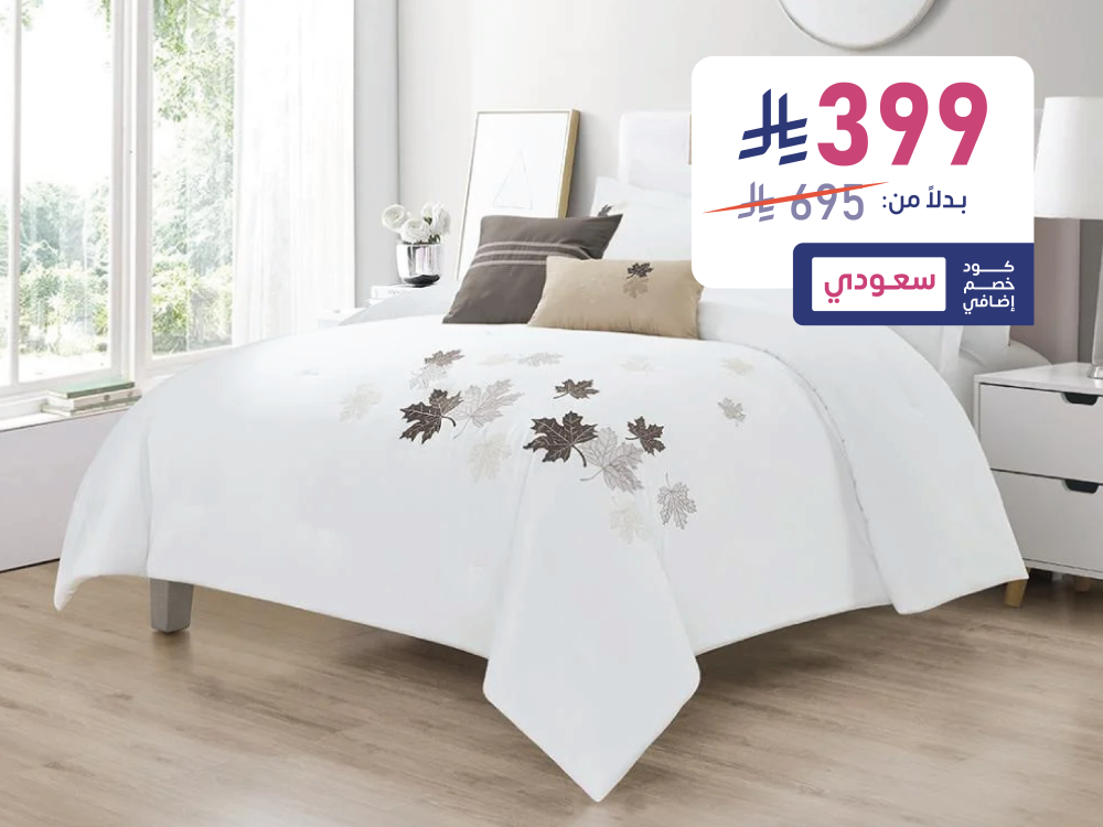 نقدم لك مفرش سوسنا لـ صيف من ماركة مفارش العييري الخاصة المزين بتطريز خلاب ومتناسق مما يعطيه منظراً فاخراً وجذاباً من أجل شعور مريح مثل ملامسة الغيوم إذ يمتاز بخامة القطن عالية الجودة التي ستشعرك بالراحة والنعومة اللازمة من أجل نوم مريح ويمتاز المفرش بتصميمه الحيوي والبارد من أجل نوم هانئ وصباح مليء بالنشاط .
