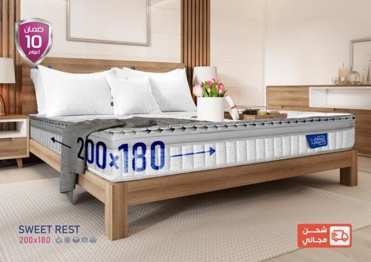 - مراتب سويت ريست (Sweet Rest): تعتبر خيارًا مثاليًا للأوزان المتوسطة، حيث تحتوي على 8 طبقات مقسمة على 3 أجزاء، بما في ذلك طبقة من الإسفنج عالي المرونة الذي يتكيف مع شكل الجسم أثناء النوم.