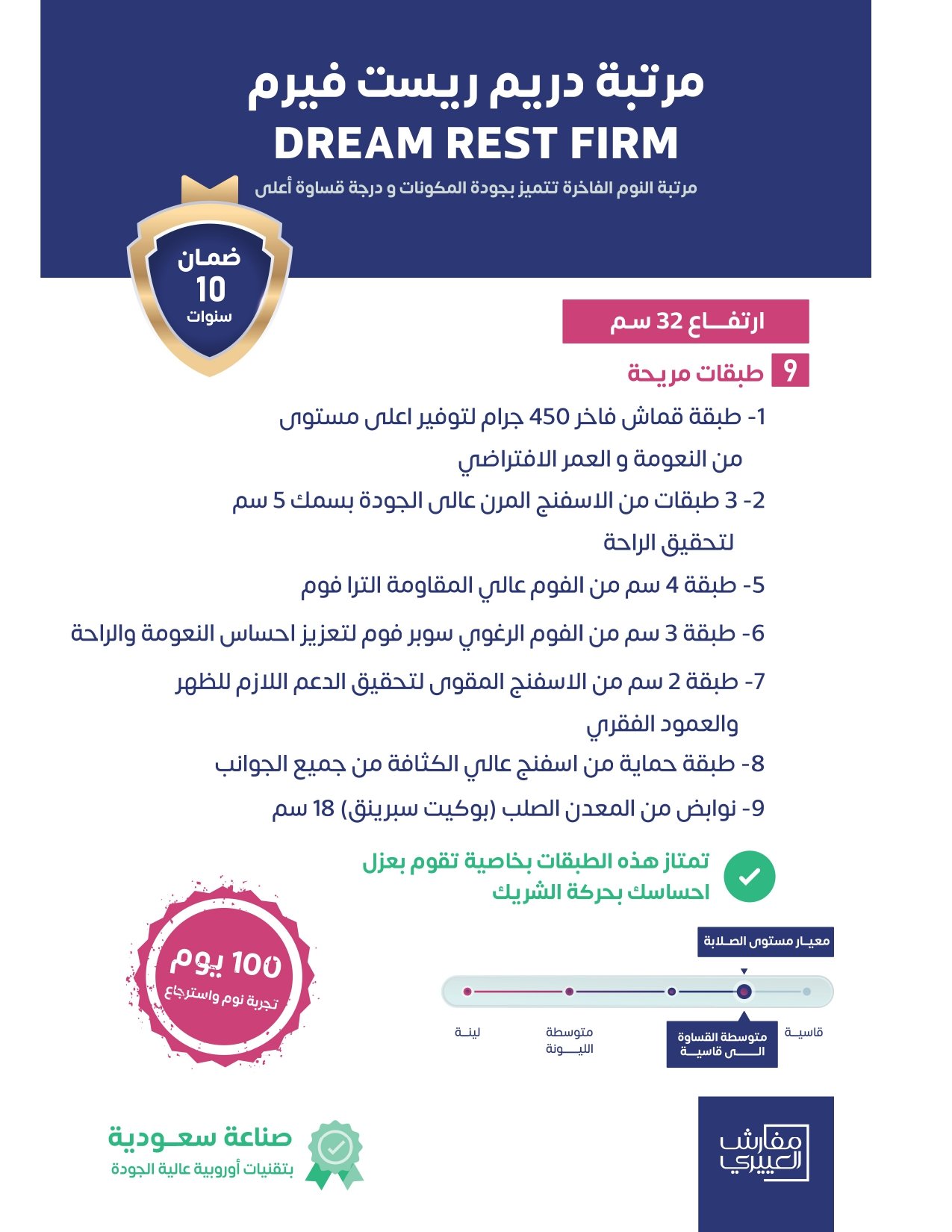 مراتب سرير- دريم ريست فارم ضمان 10 سنوات من ماركة مفارش العييري الخاصة