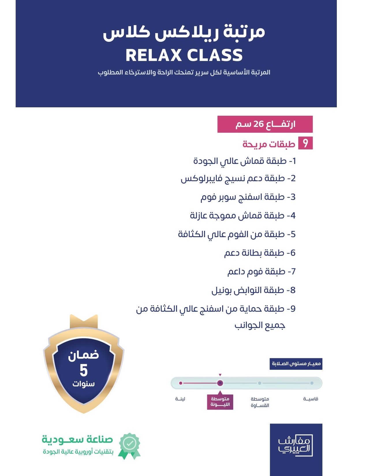 لأننا في مفارش العييري نسعى لتكون منتجاتنا ذات جودة عالية تحقق رضى عملائنا الكرام, حيث نبحث لكم عن الأفضل دائماً و سعياً منا لتعزيز الثقة بمنتجاتنا نقدم لكم ضمان مرتبة ريلاكس كلاس : بمدة 5 سنوات على العيوب المصنعية .