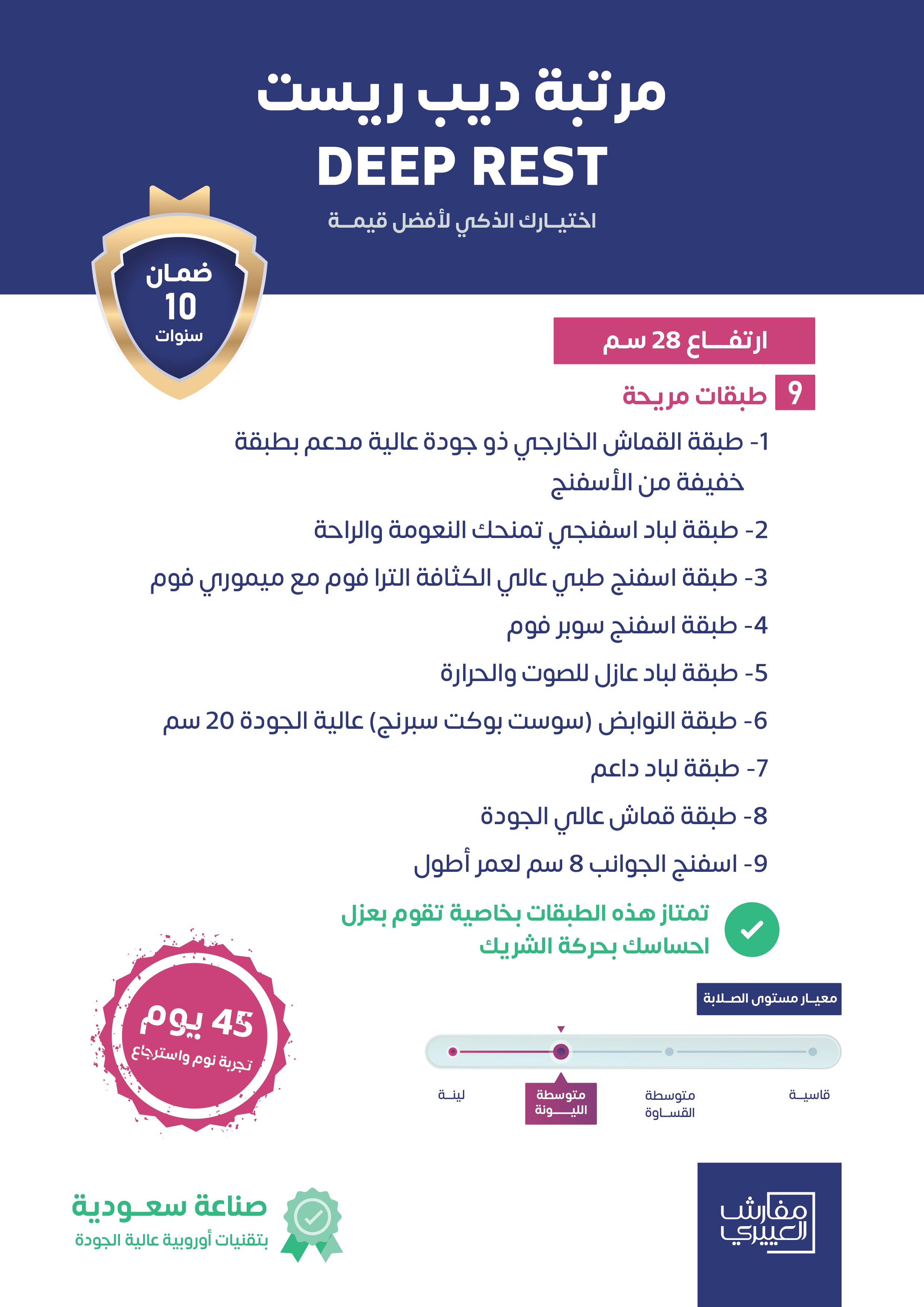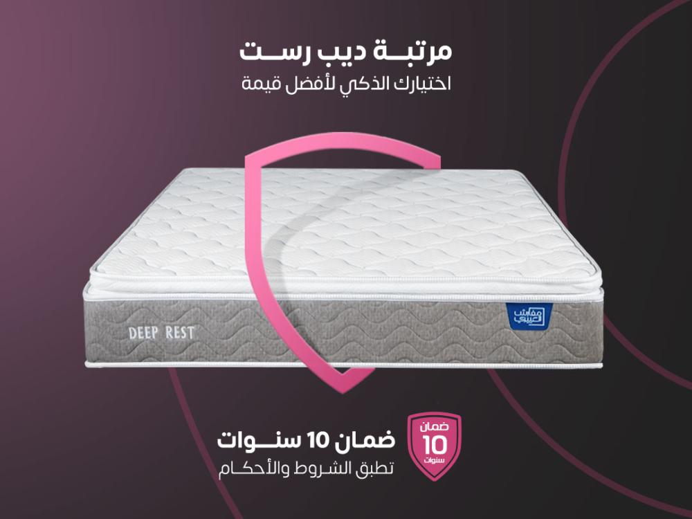 نقدم لكم مرتبة ديب ريست من ماركة مفارش العييري الخاصة حيث مرتبة ديب ريست هي الخيار الأنسب لمن يبحث عن مرتبة نوم متميزة بخصائصها الفريدة الداعمة للعمود الفقري و العازلة لحركة الشريك لتقضي ليالي نوم هانئة